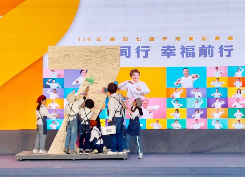 今日記者會特別邀請7位與盧市長2018年上任同一年出生的孩子擔任嘉賓,盧市長與孩子High5並開心說,「他們7歲,我上任七年!」,孩子與市長一同彩繪台中7年來代表性建設的藝術裝置,象徵「為城市上色」,陪孩子見證台中7年來的成長與變化。