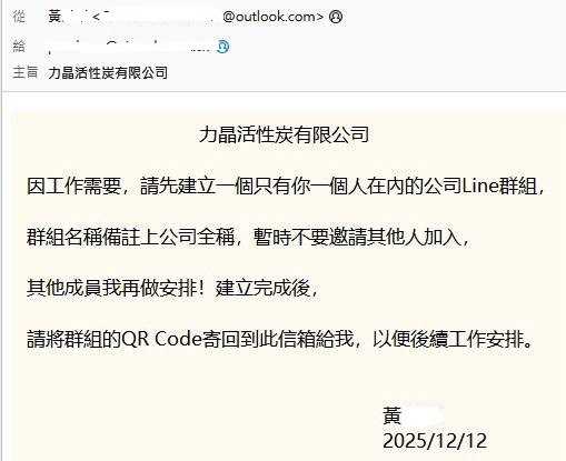 據了解,詐欺集團疑似蒐集齊立水資源公司吳副總之名片資訊後,冒充黃董事長身分,透過電子郵件寄送訊息給吳副總。所幸吳副總於收信後立即向董事長本人查證,迅速確認該封電子郵件係詐欺集團冒名所發,及時阻斷後續可能發生之詐騙行為,成功避免公司及員工受害。經警方初步研判,該封偽冒信件內容係以董事長名義要求吳副總協助「成立 Line 群組」,並將公司全體同仁加入,該手法疑為詐欺集團蒐集企業內部通訊名單,或作為後續發送詐騙指令(如要求匯款、交付內部資料等)之鋪陳,相關實際犯意與後續動向,警方仍將持續蒐證與觀察。