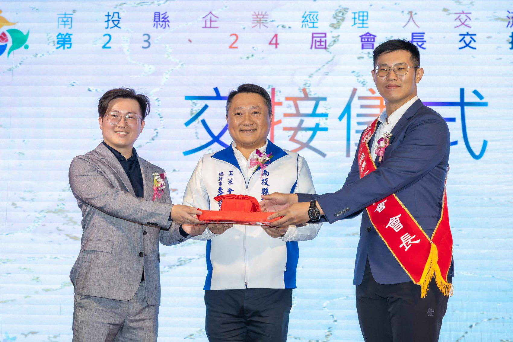 南投企業經理人交流協會於今(17)日在草屯成都婚宴會館,舉辦「第23、24屆會長交接典禮」,縣長許淑華到場及與會貴賓一同觀禮。交接儀式由工策會總幹事李哲華擔任監交人,卸任理事長葉光哲將會長彩帶及印信交接給新任會長施宜廷,施會長並介紹新任幹部,過程簡單隆重。