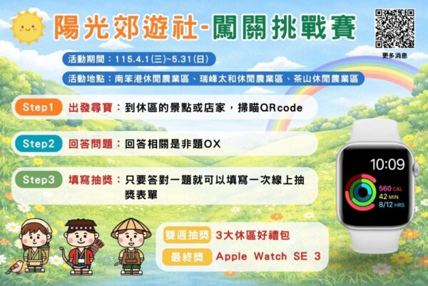 為鼓勵民眾走入農村、親身探索,體驗嘉義豐富的在地風情與淺山生態之旅,嘉義縣政府加碼推出「嘉義縣陽光郊遊社-闖關挑戰賽」活動,即日起至5月31日,民眾前往南笨港、瑞峰太和及茶山休閒農業區指定景點或店家,掃描QR Code回答問題即可獲得抽獎資格,並採多點參與機制,完成關卡越多中獎機會越高!活動期間除設有雙週抽獎外,最終也將抽出 Apple Watch SE 3獎項,期望透過寓教於樂的方式,吸引更多民眾認識嘉義休區之美,並將永續環境理念落實於生活。