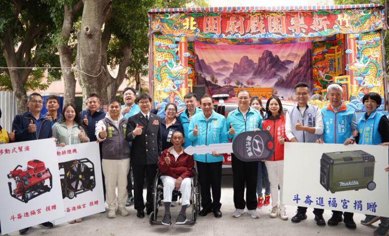 新竹縣竹北市斗崙里進福宮集結信眾愛心今(19)日捐贈消防局1輛全新災情勘查車、1台攜帶型保冷箱、1台電動排煙機及1台移動式幫浦,總價值達210萬元,副縣長徐元棟期待在各界支持下,能提升消防同仁執行各項消防勤務之品質、效率及安全,以保障縣民生命安全。