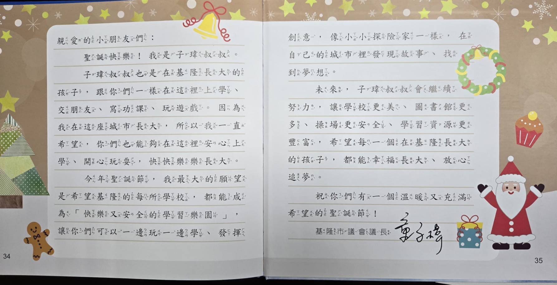 有關近期基隆市議長童子瑋以個人名義贈送全市國小生每人聖誕繪本至學校,然童子瑋近期業於媒體公開並宣佈,若年底獲徵召將參選市長,成為準市長候選人。考量學校應遵循教育及行政中立相關法令,市府將婉謝議長此次贈書。