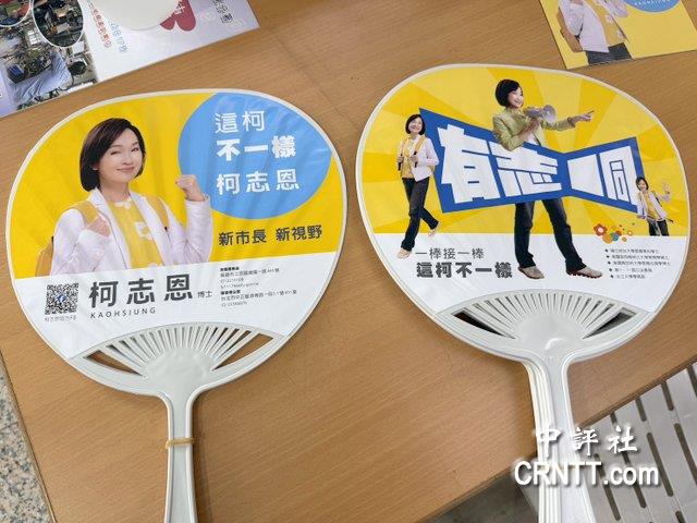 國民黨高雄市黨部8日發放藍委柯志恩“有志一同”年曆海報,現場也有準備扇子供索取。(中評社)
