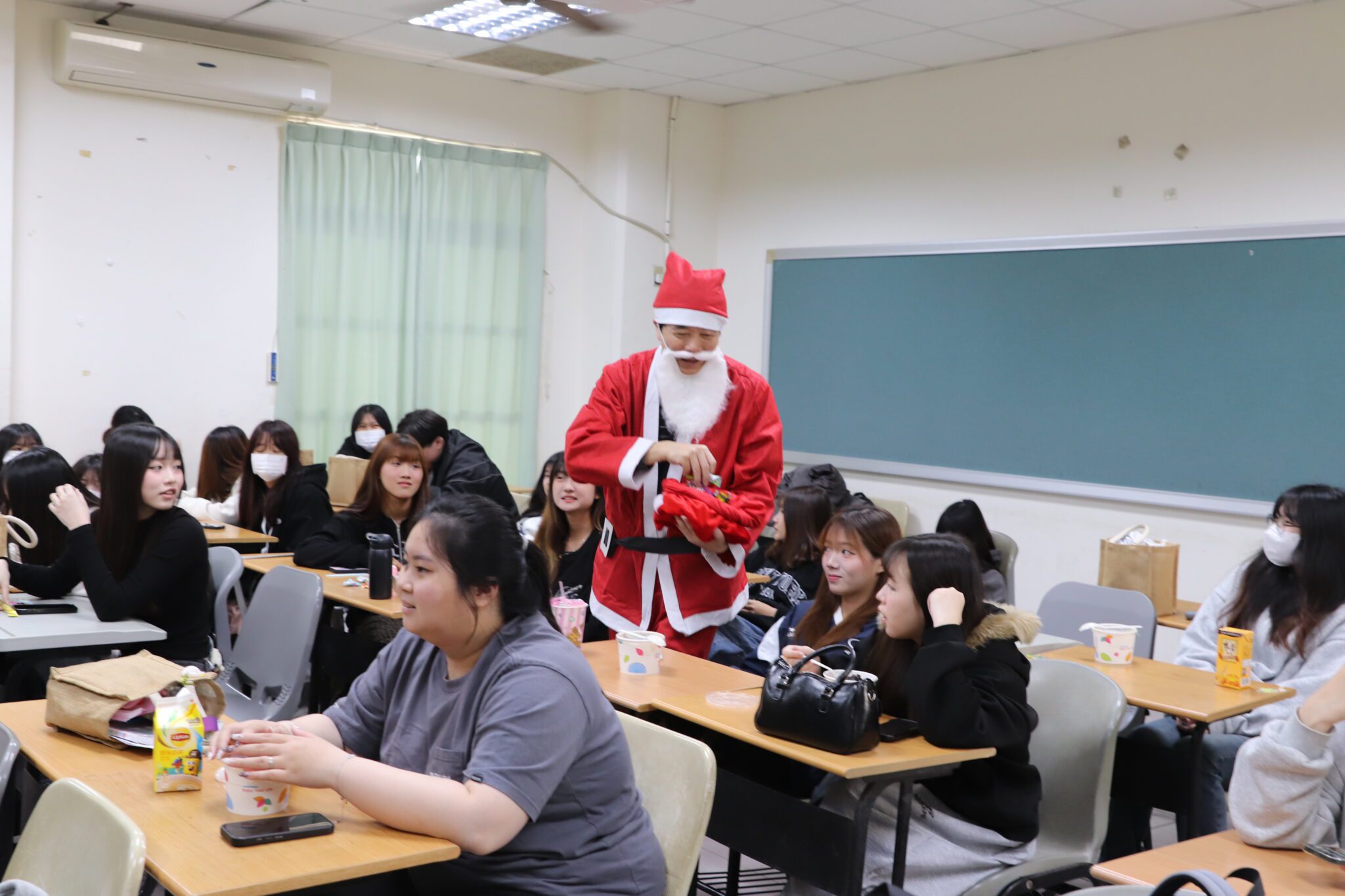 除了走逛校園發送糖果和餅乾,華醫的聖誕老人和麋鹿團也以快閃方式,隨機進到教室和師生同歡,讓不少正在開班週會的師生驚喜連連,大家開心搶著和聖誕老人拍照。來自越南的外籍生,看到聖誕老人和麋鹿出現在教室驚喜歡呼,並對學校用心營造歡樂氣氛感到窩心。