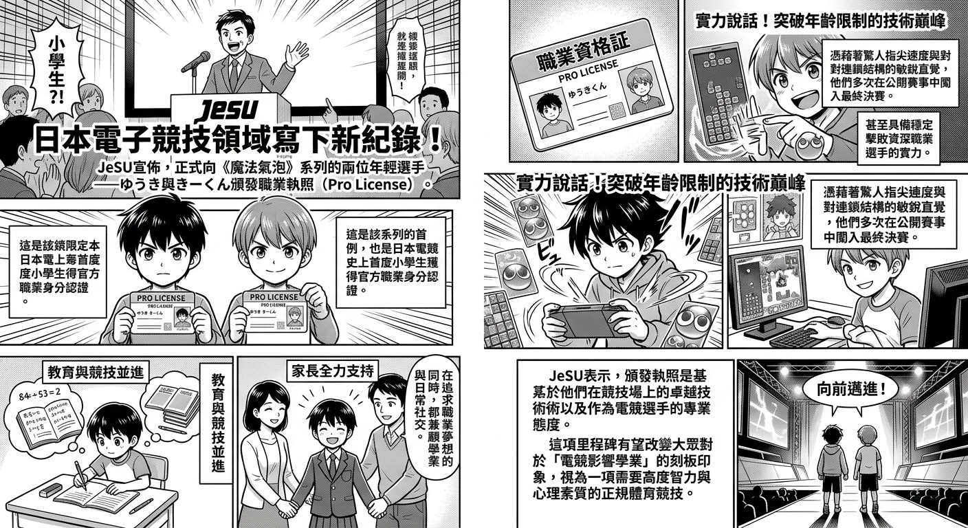 日本電子競技領域寫下新紀錄!日本電競聯合會(JeSU)宣佈,正式向《魔法氣泡》系列的兩位年輕選手——ゆうき(Yuuki) 與 きーくん(Kiikun) 頒發職業執照(Pro License)。這是該系列的首例,也是日本電競史上首度小學生獲得官方職業身分認證。