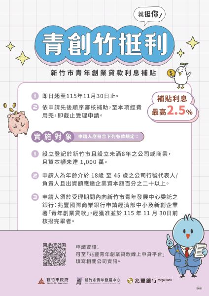 青年發展中心補充,115年「竹挺利」青年創業貸款利息補貼,申請資格為18至45歲青年,其公司或商業須設立於新竹市且未滿8年,並經核准取得「青年創業貸款」者,即可透過兆豐國際商業銀行提出申請(網址:https://reurl.cc/R9oN6G)。申請方式採「先申請、先受理」,至經費用完為止,歡迎符合資格的青年朋友把握機會,善用市府資源,加速事業成長。