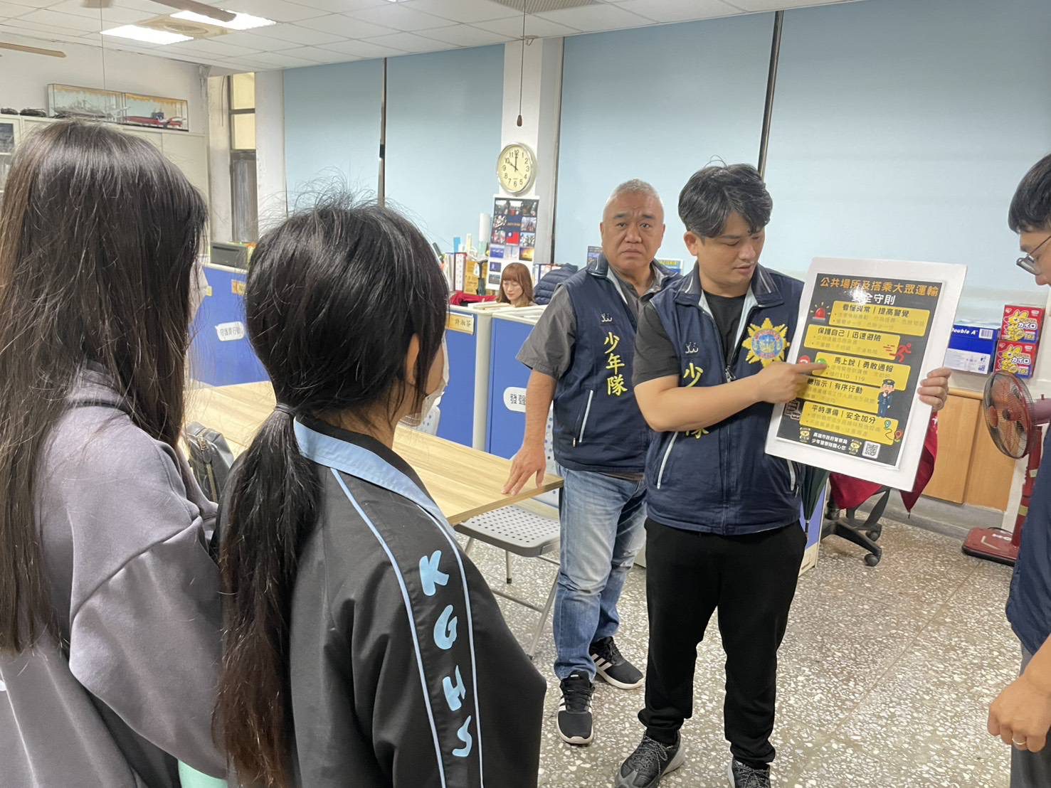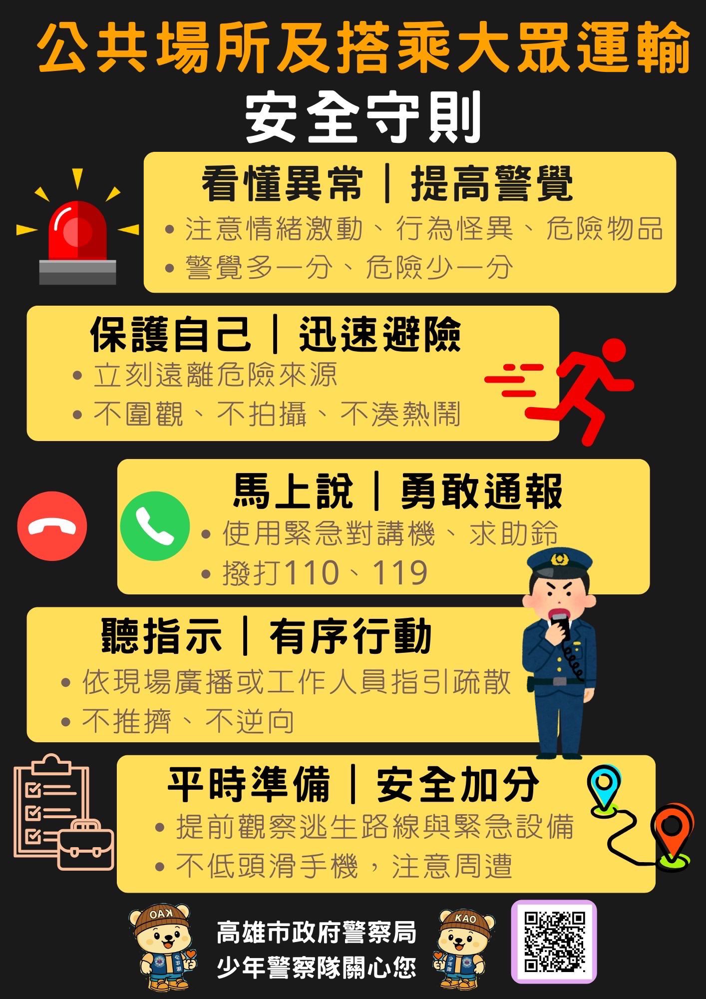因應近日臺北市捷運站、百貨公司等公共場所發生隨機暴力重大案件,引發社會高度關注,高雄市政府警察局少年警察隊秉持「預防重於事後處理」原則,連夜自製「公共場所及搭乘大眾運輸安全守則」宣導梗圖海報,主動走入校園與大型活動現場,加強學生與市民的安全警覺、自我保護及安維應變能力。