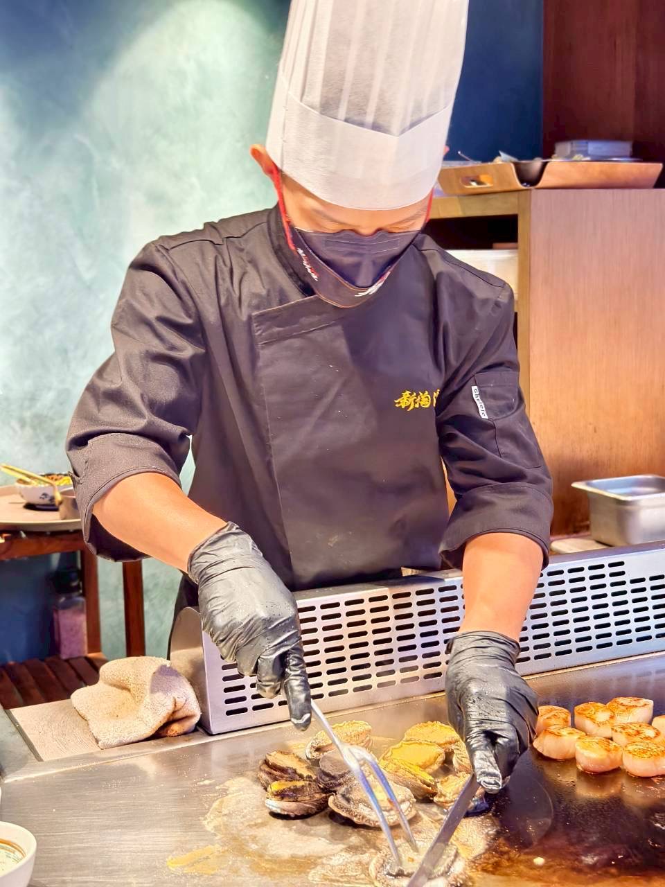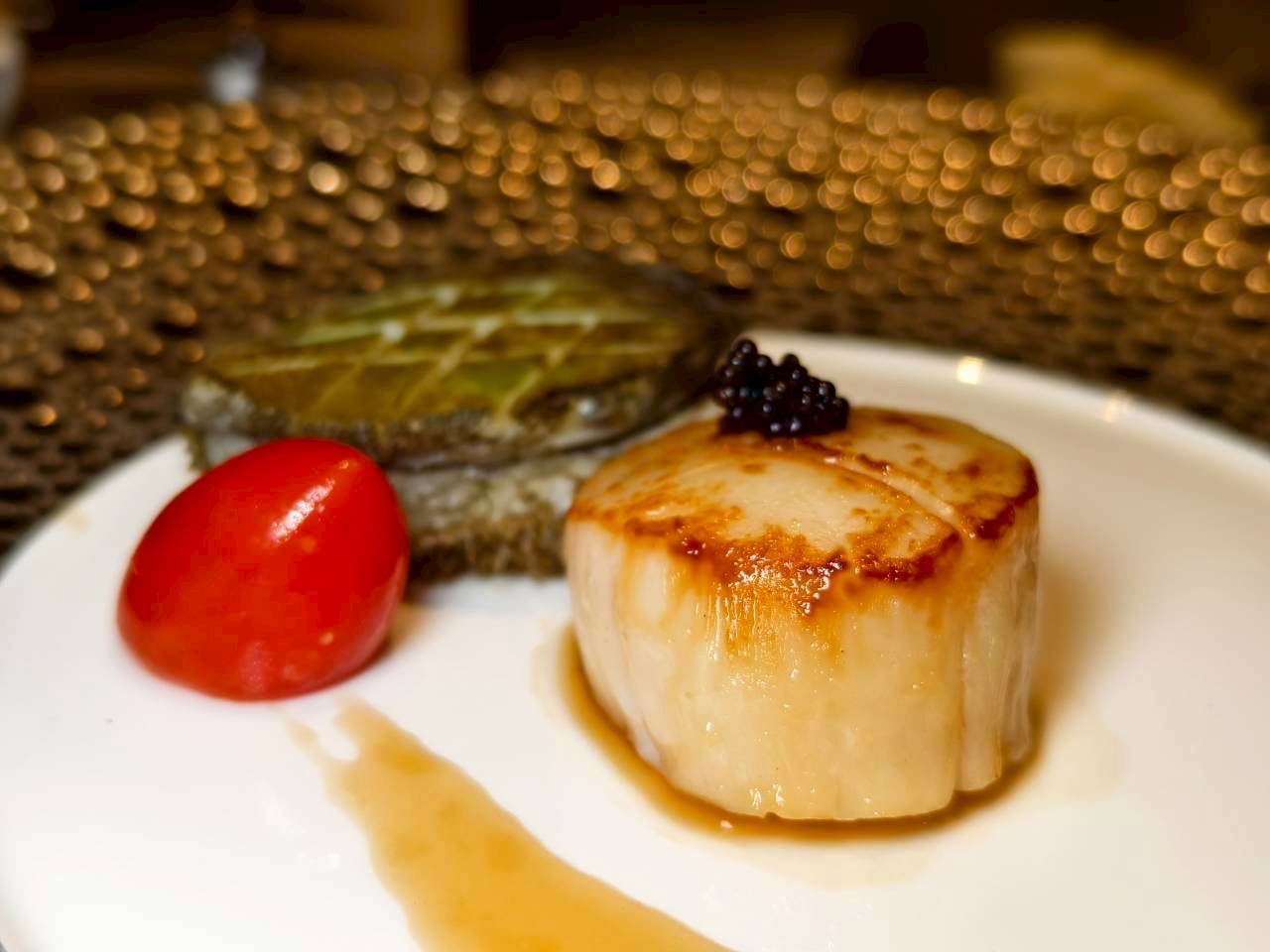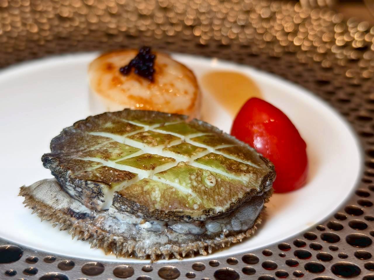 海味料理的亮點還不只如此。另一道令人驚艷的是接近手掌大小的活鮑魚。鮑魚在高溫鐵板上迅速煎炙,外層帶著微微焦香,內部卻依舊保有彈性與水潤口感,搭配5A生食級大干貝一同呈現,無論視覺或味覺都充滿層次。干貝在鐵板上煎至表面金黃,入口柔嫩細緻,鮮味在口中緩緩釋放,與鮑魚的彈牙口感形成鮮明對比。