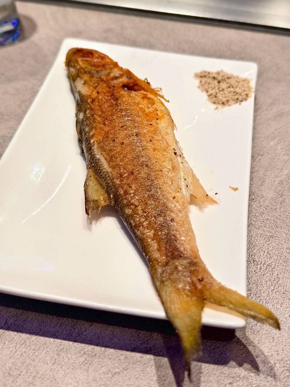 魚料理部分則以午仔魚作為亮點。午仔魚在鐵板上煎至外皮金黃酥脆,魚肉則保持細嫩滑順的口感。師傅僅以少許鹽巴提味,便能將魚肉本身的鮮甜完整帶出,沒有多餘調味的干擾,反而更能凸顯食材本身的品質。