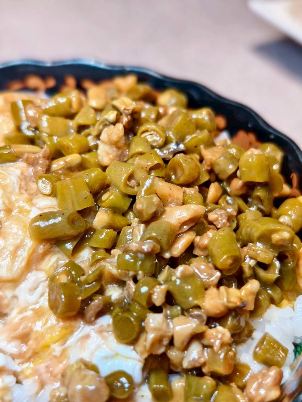 更令人驚喜的是一旁搭配的酸豇豆。鹹香滑嫩的醬油蛋與粒粒分明的白飯本就十分合拍,再加上一口酸辣爽脆的豇豆提味,讓整體口感瞬間多了清爽與層次。簡單幾樣食材,卻透過火候與搭配,呈現出令人難以抗拒的美味。