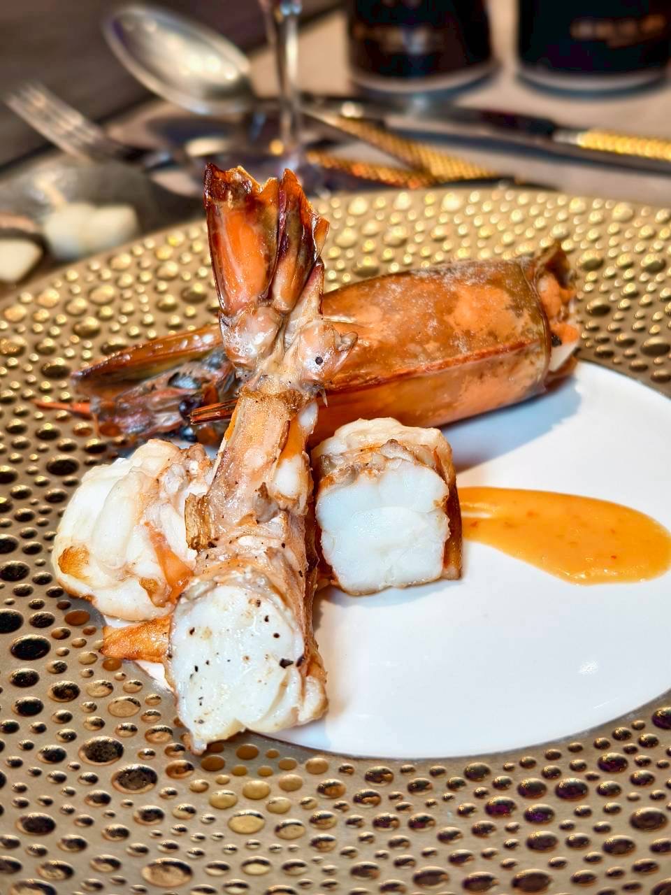 走進餐廳,鐵板前的料理秀立刻成為目光焦點。熱油與食材接觸時發出的滋滋聲響,伴隨著不斷飄散的香氣,為整場用餐揭開序幕。主廚先以氣勢十足的海鮮料理登場,其中最吸睛的莫過於一尾體型驚人的菲律賓海虎蝦。蝦身尺寸幾乎逼近小龍蝦等級,剪開蝦殼的瞬間熱氣直衝而上,厚實的蝦肉緊實Q彈,每一口都帶著鮮甜彈牙的口感,展現出高品質海鮮應有的細膩風味。