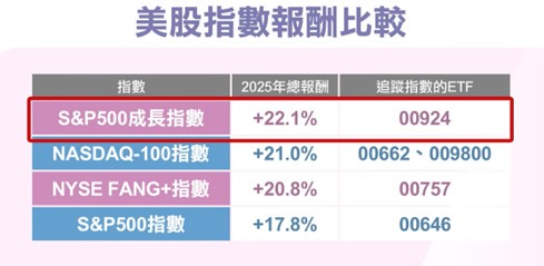 葉芷娟分析,00924受歡迎主因有二,首先是績效表現亮眼,該ETF追蹤S&P500成長指數,自標普500母池中精選200多家具高營收與獲利成長動能的企業,雖屬大盤衍生指數,但長期報酬表現明顯優於大盤。該指數2025年總報酬率約22.1%,不僅超越標普500指數約5%,表現更勝科技股的那斯達克100指數與FANG+指數。
