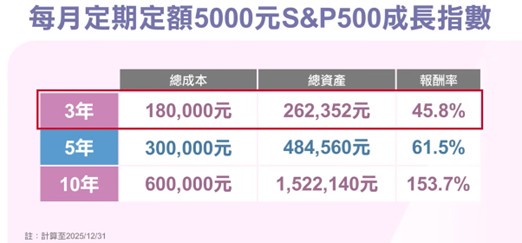 針對想參與美股卻擔心進場時機的投資人,葉芷娟建議採取定期定額策略,以每月5,000元投入S&P 500成長指數試算,三年累積投入18萬元後,資產可望成長至約26萬元;五年投入30萬元,有機會累積至48萬元;若持之以恆十年,資產規模可望突破150萬元。這正是透過紀律與時間發揮複利效果,有助於降低短線波動帶來的心理壓力。