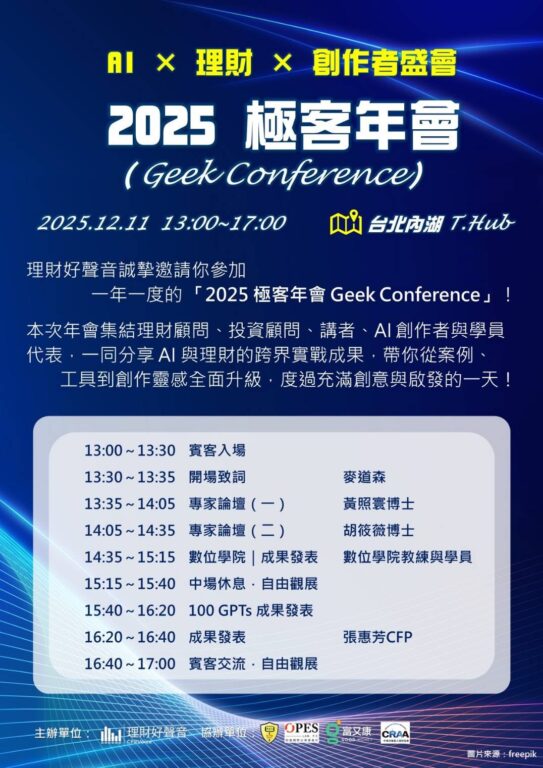 由理財好聲音主辦、神隊友數位等單位協辦的年度盛事「2025 理財極客年會 (Geek Conference)」於(12月11日)在台北南港 T.Hub 圓滿落幕。這場以 AI × 理財 × 創作者盛會為主題的年會,成功集結了理財顧問、投資專家、AI 創作者與產業意見領袖。年會的成功不僅展現了跨界整合的趨勢,也突顯了在數位轉型浪潮中,高效工具應用與策略思維的重要性。