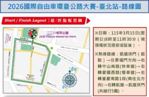【民眾網編輯方笙楠臺北報導】「2026國際自由車環臺公路大賽-臺北站」訂於115年3月15日(星期日)8時至11時30分,假本市凱達格蘭大道、中山南路、信義路、杭州南路、愛國西路及仁愛路等路段舉行,屆時將有來自全球22支職業車隊參賽,臺北市政府警察局為維護交通秩序與活動安全,將實施交通管制,禁止人、車通行,管制時(路)段如下: