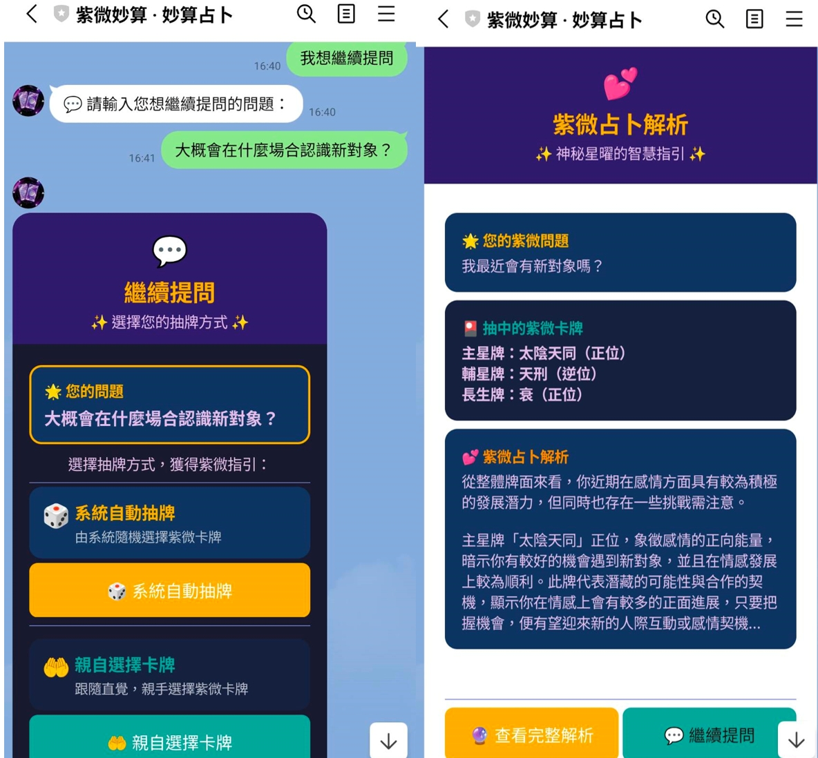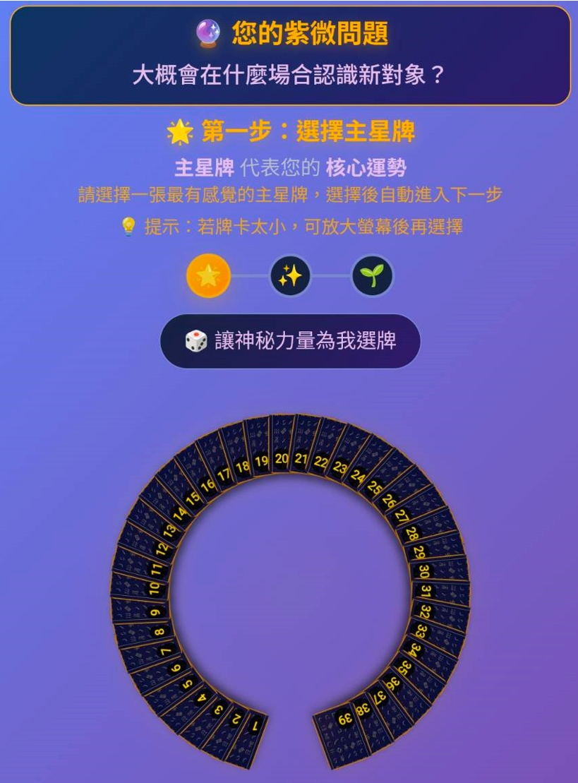 《紫微妙算 · 妙算占卜》透過直覺化的牌卡互動設計,使用者僅需加入 LINE官方帳號,即可隨時線上抽牌占卜。系統將依據抽取牌卡結果,由AI即時提供牌面分析與行動建議,整體體驗溫馨流暢,讓占卜不再只是單純預測未來,更是一場深入自我、探索內在潛意識的智慧對話。