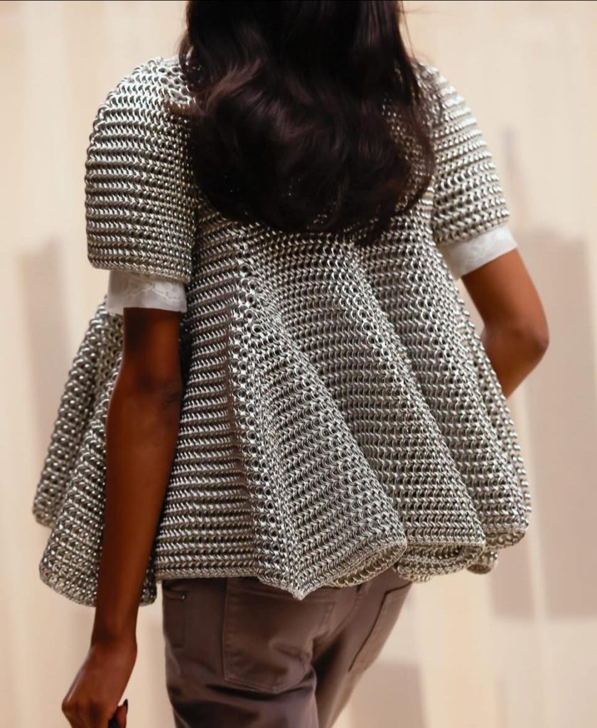 一圈圈銀色鏈結,既堅硬又柔軟;既是防護,也是裝飾。當密集的金屬結構在身體上展開,輪廓線像建築般重新建立比例。