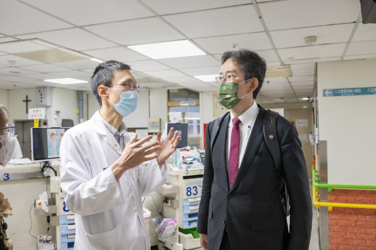 ▲Ihara教授(右)至彰基中風病房,由林志明主任說明彰基對腦血管疾病患者的照護,及在精準醫療的臨床研究現況。(圖╱彰基提供)