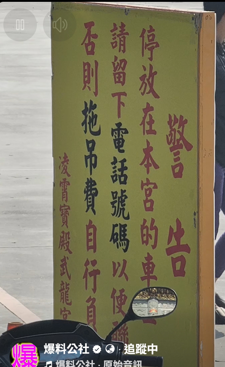 從影片可以看到,鏟車熟練地將轎車前端抬起,旁邊還有不少民眾圍觀拍照。更妙的是,現場還立了一塊告示牌,上頭寫著「敬告停放在本宮的車輛,請留下電話號碼以便通知」等字樣,看來廟方已經提醒得很清楚了。