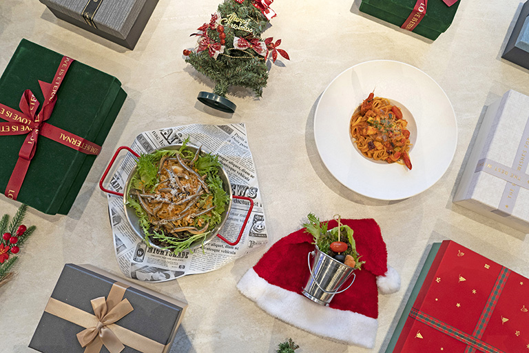 「聖誕花籃」以清爽生菜沙拉搭配炸虱目魚柳、莫札瑞拉起司,鹹香黑橄欖與清爽微酸的蕃茄,為整體風味帶來平衡,售價$120。「琥珀光影南瓜濃湯」,鮮奶油拉花與南瓜籽點綴,為節慶揭開序幕,售價$120。「炸丁香魚義大利麵」是源自義大利西西里島的傳統風味,以鯷魚、甜葡萄乾、蒜香、微辣麵包酥為基底,鹹甜辣層次交織,再融合台灣熟悉的炸丁香魚,展現異國料理語彙與在地飲食間的巧妙對話,售價$480。「香辣番茄蝦仁義大利麵搭茄汁燉菜」以鮮紅番茄與彈嫩蝦仁呼應聖誕意象,結合法式燉蔬料理手法,傳遞團聚時刻的暖意,售價$520。