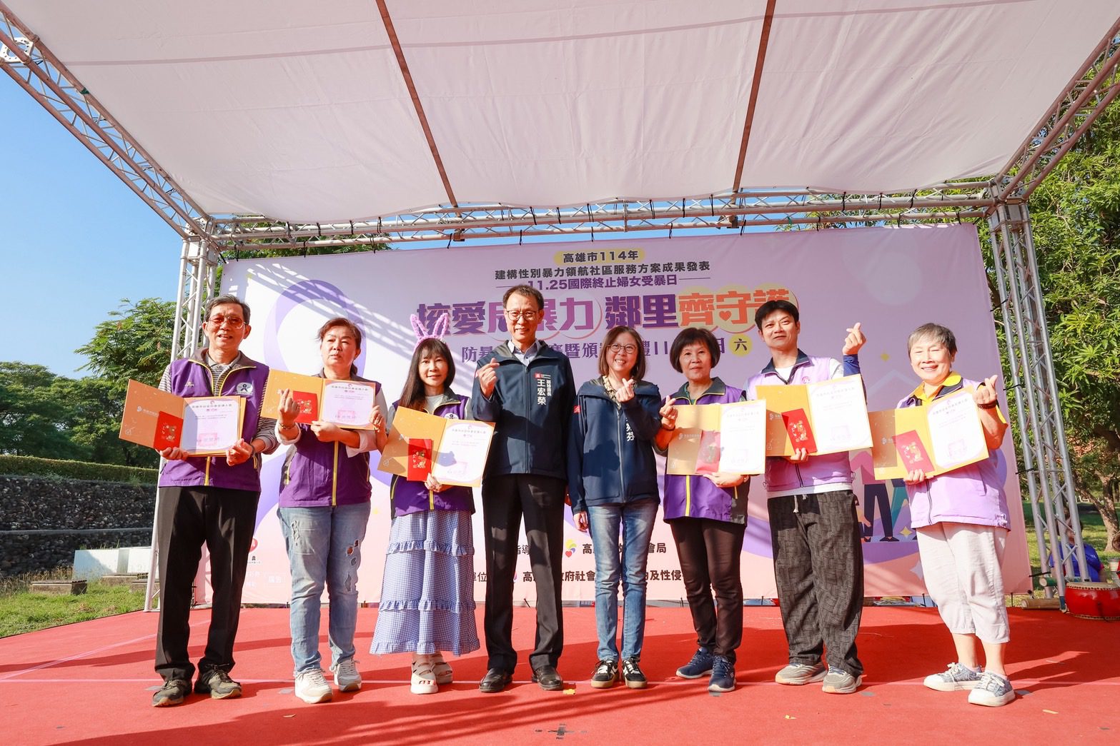 為響應「國際終止婦女受暴日」,社會局家防中心於今(22)日下午在衛武營都會公園夏日大道舉辦「114年度國際終止婦女受暴日宣導暨建構性別暴力領航社區服務方案成果發表活動」,以「擁愛反暴力,鄰里齊守護」為主題,串連跨局處網絡與社區力量,共同推動暴力防治與初級預防工作。活動以象徵性別平等與力量提升的紫絲帶意涵,由市府王宏榮副秘書長、社會局蔡宛芬局長、貴賓及社區夥伴共同傳遞紫絲帶,象徵凝聚公私協力的守護能量,一同承諾「拒絕暴力、從社區開始」啟動,共織屬於高雄的紫絲帶,並吸引超過800名親子與市民熱情參與,在輕鬆有趣的氛圍中認識家暴防治、兒少保護等重要觀念。