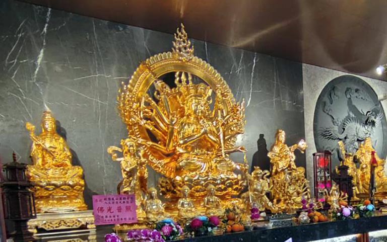 ▲以珍貴璋木精細雕刻,再全身鋪以金箔精塑而成的千手觀音菩薩。(圖/記者范文濱攝)