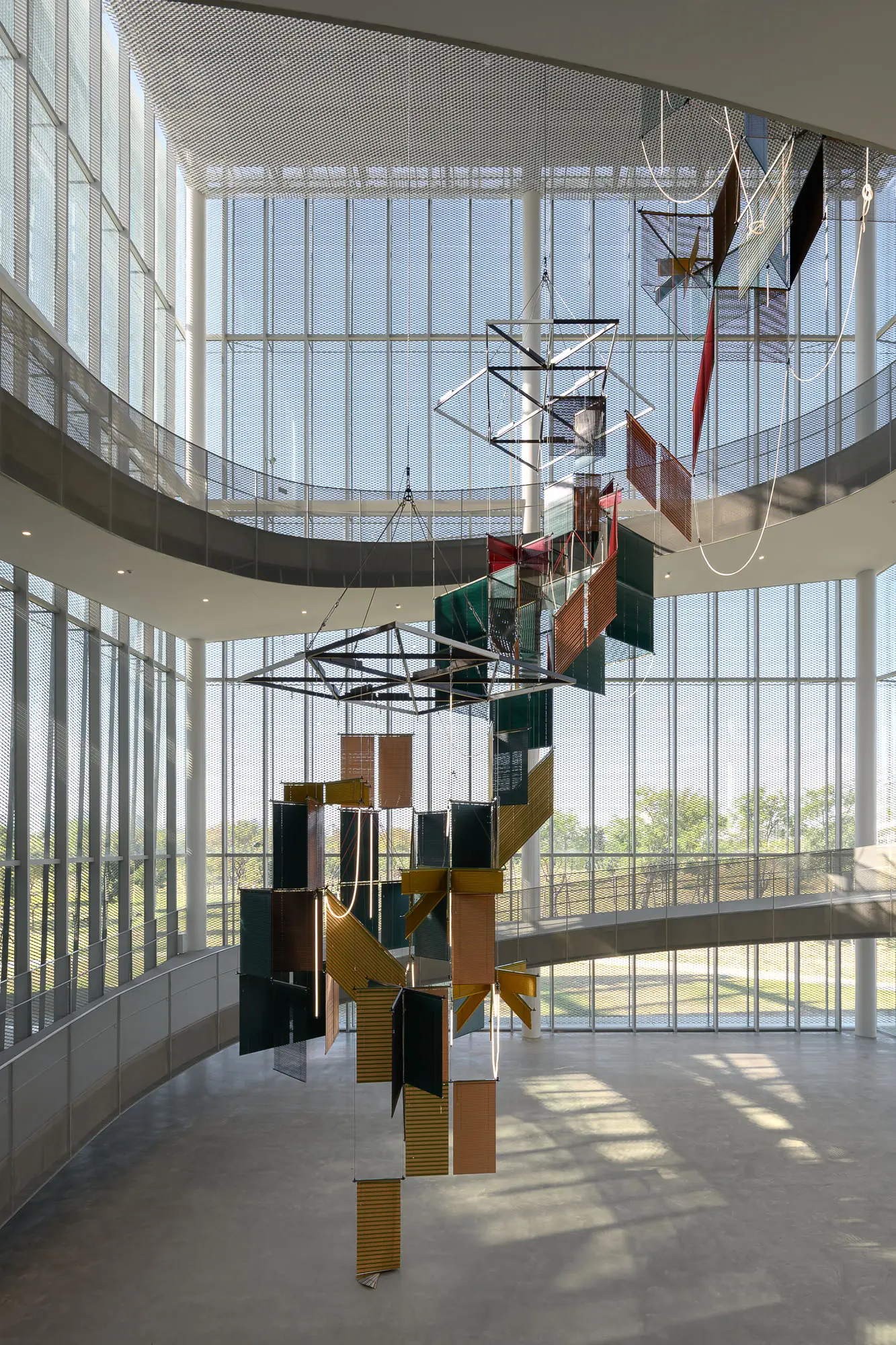 梁慧圭的作品《流動奉獻-樹蔭三合》(Liquid Votive – Tree Shade Triad)為她在臺灣的首件委託創作,靈感取自世界各地共通的敬樹傳統。作品懸掛於美術館中庭,挑高27 公尺讓這件作品宛如一棵倒生著、連結天地的「宇宙之樹」。作品以她標誌性的百葉簾結構構成,日間,金屬葉片反射自然光影;夜晚,則映現著柔和的螢火蟲微光,與環境的呼吸節奏呼應。梁慧圭期待觀眾沿著美術館坡道環繞漫步,在移動與光影變化中展開一場關於時間與共感的冥想。