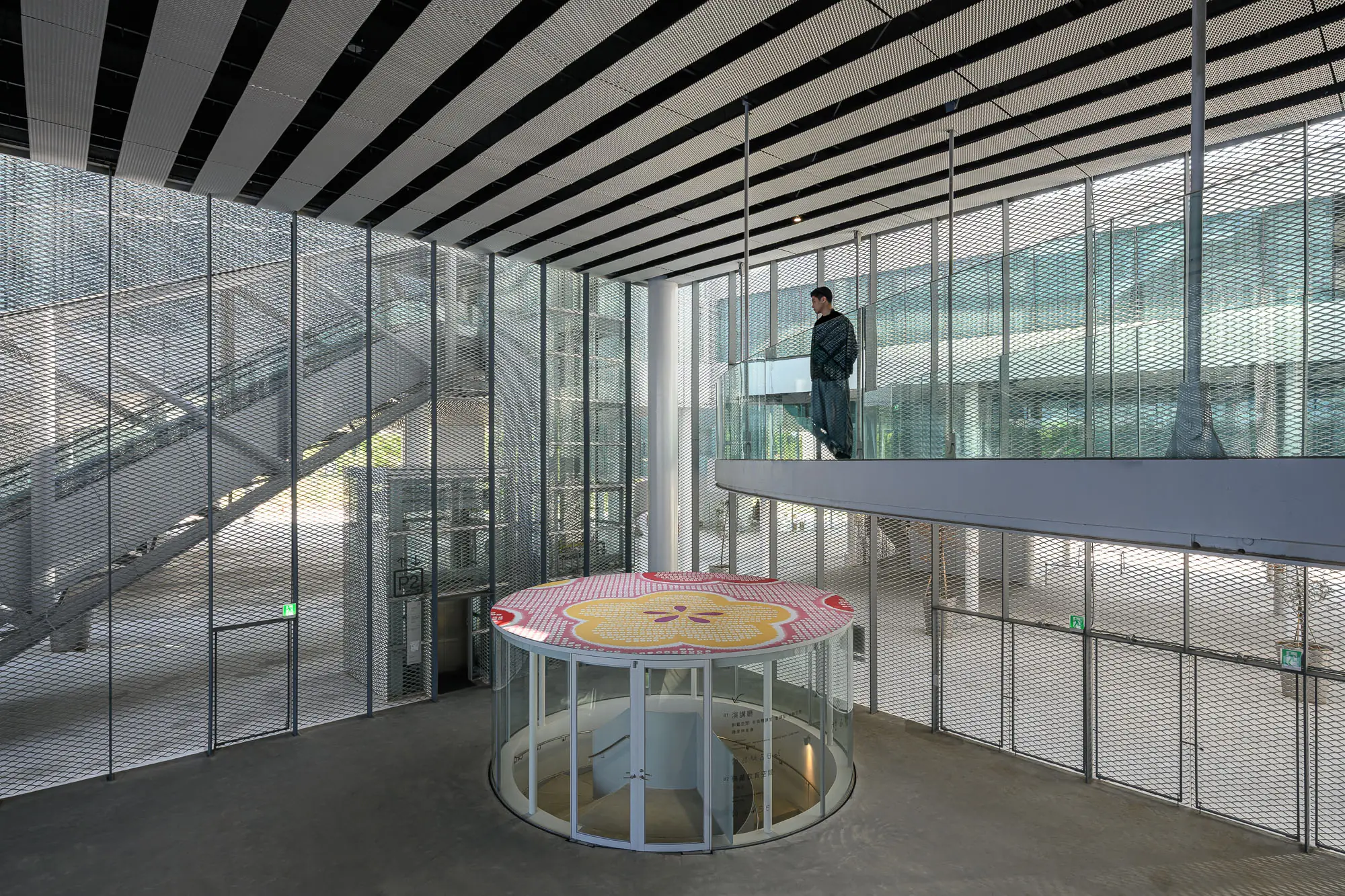 林明弘的《再製》(Processed)則以另一種姿態與建築結構巧妙交織。兩組手繪梅花圖樣佔據入口大廳的兩間玻璃屋屋頂:一組線條精確,另一組錯位重疊,透過如印刷過程中的重疊與錯置手法,將具有時代意義的「臺灣花布」圖騰賦予新意。當觀眾在連通美術館與圖書館的天橋上移動時,可以發現圖樣隨視角轉換而變化,構成一場關於感知、觀看與空間的詩意對話。林明弘認為觀眾的觀看也是作品的一部分,使藝術不再僅是被注視的對象,而是與建築、身體、光影共同生成的經驗。