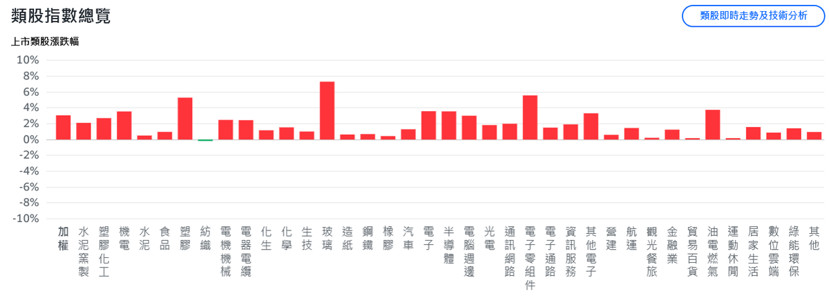 台積電漲幅一度達4.6%,電子權值股同步揚升,鴻海上漲來到238元,電零組件指數由台達電領軍,整體上漲近5%,半導體族群強彈近4%,記憶體重獲買盤青睞,華邦電、南亞科全面噴出,激勵相關供應鏈同步走強。