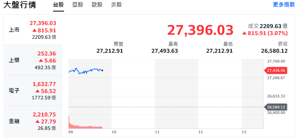 輝達盤後股價勁揚,帶動台股週四(20日)回神反攻,台積電早盤強彈65元至1460元,一舉激勵加權指數飆漲逾900點,最高至27493點,重返10日線,櫃買指數同步勁揚2.6%,盤面呈現百花齊放,預估成交量放大至7400億元。