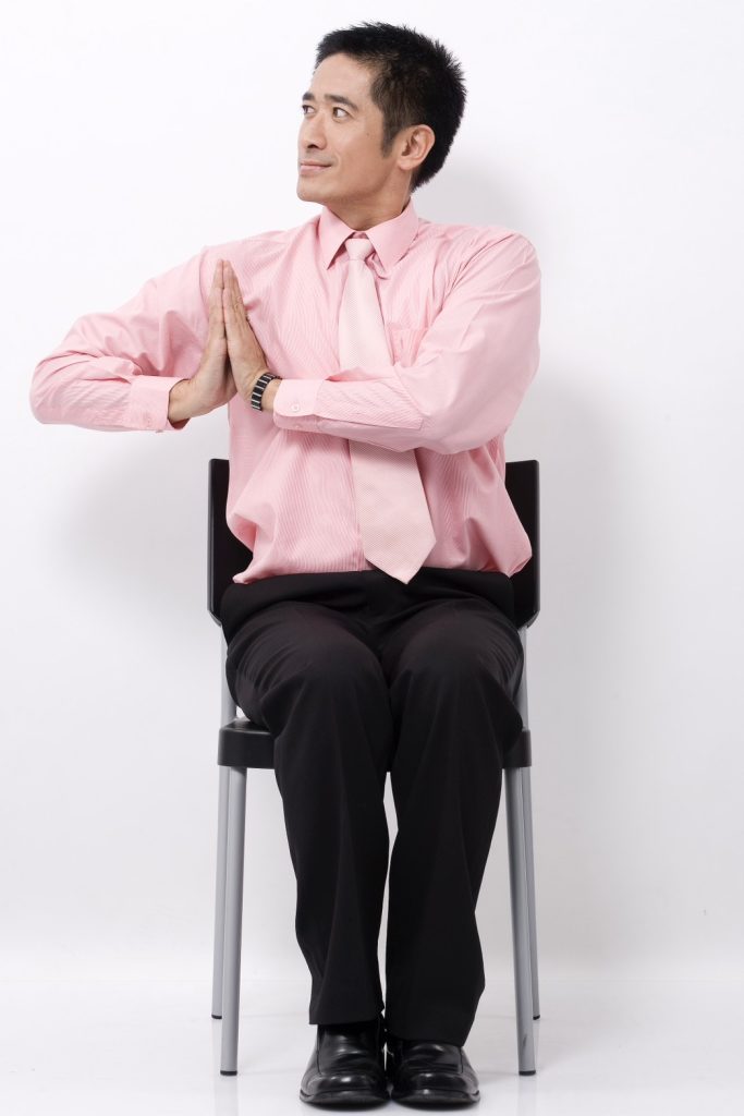 進入核心的推移動作,雙掌向左推:配合深長的吐氣,慢慢將合十的雙手向左方推送,此時你會感覺到右側肩部與三角肌得到溫和的伸展;待氣吐盡後,回正並再次吸氣。