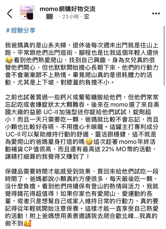 隨著戶外活動興盛,不少銀髮族將登山、健走視為生活中不可或缺的興趣。近日在「momo網購好物交流社團」中,一名女網友分享父母登山習慣與自身選購保健品的經驗,引來大量網友共鳴,相關討論熱度不斷攀升。