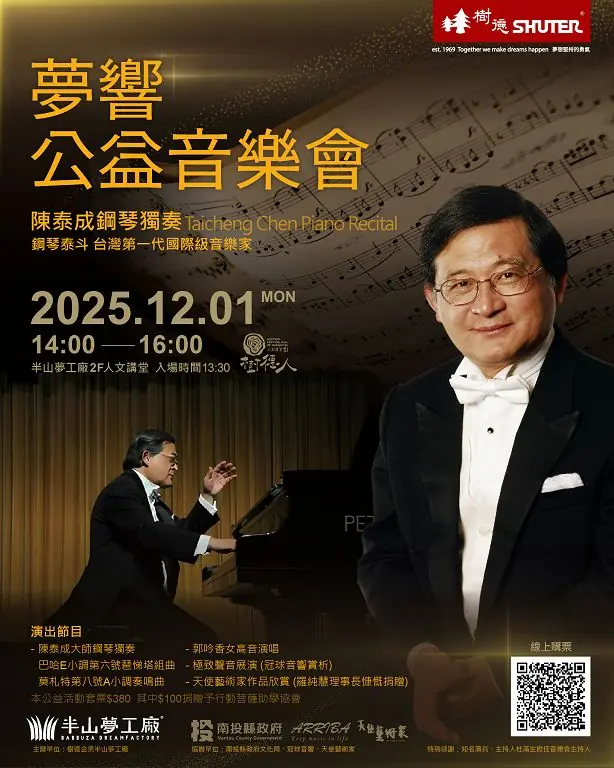 鋼琴界重量級大師陳泰成12月1日將在南投半山夢工廠舉辦公益音樂會